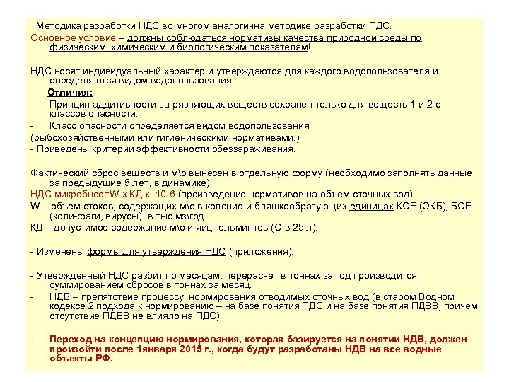Таким образом: • НДВ и НДС устанавливаются в зависимости от целевого предназначения водного объекта и по отношению к нормативам качества воды водного объекта. • При комплексном использовании водного объекта при расчете НДВ и НДС принимаются наиболее жесткие нормативы качества воды. • Возможен пересмотр сроков действия НДВ и НДС в случаях, определенных подзаконными актами. • При установлении НДВ и НДС учитывается ныне существующие состояние водного объекта, на который оказывается воздействие/производится сброс. • При расчете величин НДВ и НДС гидрологические условия принимаются как наиболее неблагоприятные из возможных. . 110