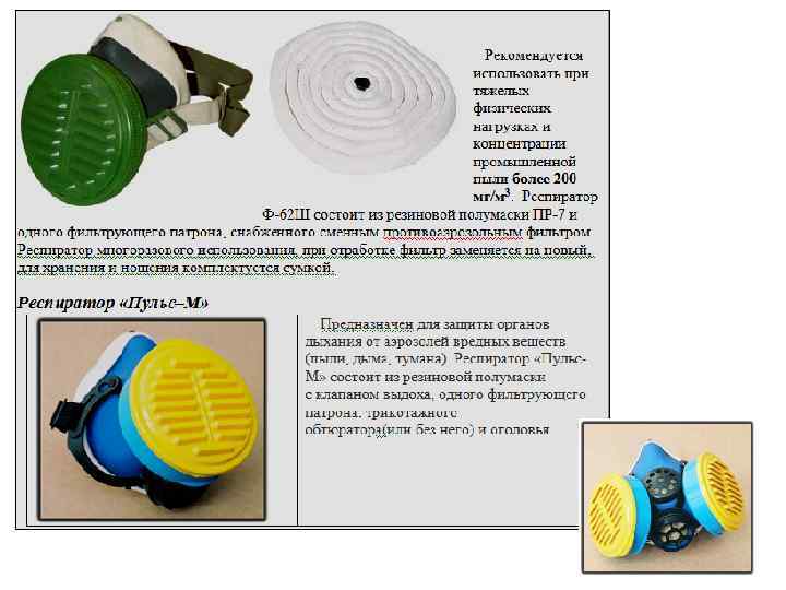 Меры профилактики пневмокониоза • медосмотры; • лечебно профилактические мероприятия; • уменьшение пылеобразования, пылеподавление (инженерно технические мероприятия); • противопылевые респираторы. Согласно ПБ, на каждой шахте должен быть проект комплексного обеспыливания, утверждённый техническим директором. Инженерно-технические мероприятия делятся на три группы: 1. Снижение или устранение пылеобразования; 2. Подавление и улавливание пыли; 3. Вынос летучей пыли из выработок и обеспыливание воздушного потока. • Запрещается подача свежей струи воздуха по стволам, оборудованными скипами, опрокидными клетями; • не допускается подача свежего воздуха по наклонным стволам и выработкам оборудованным ленточными конвейерами за пределами выемочного участка; • при прочих равных условиях следует отдавать предпочтение технологиям, уменьшающим пылеобразование; • разработка и применение технологий ведения очистных работ без постоянного присутствия людей в лаве; • предварительное увлажнение угля в массиве; • орошение: очистные и проходческие комбайны, места перегрузки, погрузки, разгрузки; • пневмогидроорошение: применение водовоздушной смеси (туманообразователи могут образовывать облако длинной до 50 70 метров); • подавление пыли пеной;