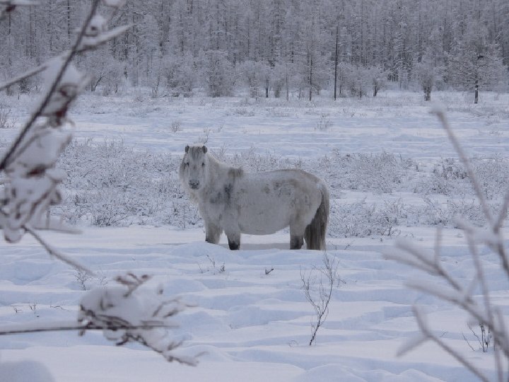 The animals of the area have adapted to the rigors of time. Oymyakon horses are very robust, short-legged and with thick fur. They have been used in many polar expeditions. They are semi-wild horses and rarely accept to be mounted. They are used as beasts of burden and their meat is highly valued by the villagers who eat very few vegetables, because most fruits and vegetables are ruined at such low temperatures. A környék állatai alkalmazkodtak az időjáráshoz; az oymyakoni lovak, nagyon erősek, rövid lábúak és vastag szőrzetűek, számos sarki expedíción használták őket. Fél-vad lovak; szinte lehetetlen lovagolni rajtuk. Igavonó állatoknak használják, és a lovak húsát a helyiek nagyon nagyra becsülik, akik nagyon kevés zöldséget esznek, mert a legtöbb gyümölcs és zöldség az ilyen alacsony hőmérsékleten tönkremegy.