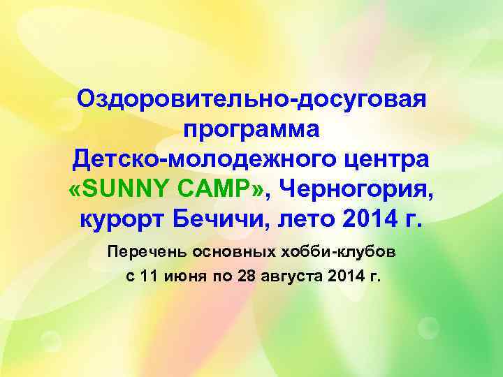 Оздоровительно-досуговая программа Детско-молодежного центра «SUNNY CAMP» , Черногория, курорт Бечичи, лето 2014 г. Перечень основных хобби-клубов с 11 июня по 28 августа 2014 г.