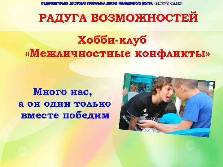 ОЗДОРОВИТЕЛЬНО-ДОСУГОВАЯ ПРОГРАММА ДЕТСКО-МОЛОДЕЖНОГО ЦЕНТРА «SUNNY CAMP» РАДУГА ВОЗМОЖНОСТЕЙ Хобби-клуб «Межличностные конфликты» Много нас, а он один только вместе победим