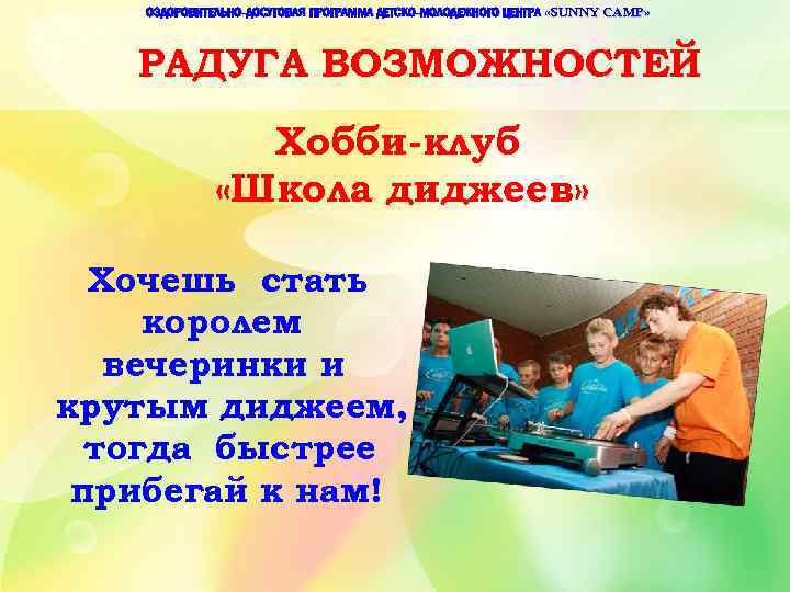 ОЗДОРОВИТЕЛЬНО-ДОСУГОВАЯ ПРОГРАММА ДЕТСКО-МОЛОДЕЖНОГО ЦЕНТРА «SUNNY CAMP» РАДУГА ВОЗМОЖНОСТЕЙ Хобби-клуб «Школа диджеев» Хочешь стать королем вечеринки и крутым диджеем, тогда быстрее прибегай к нам!