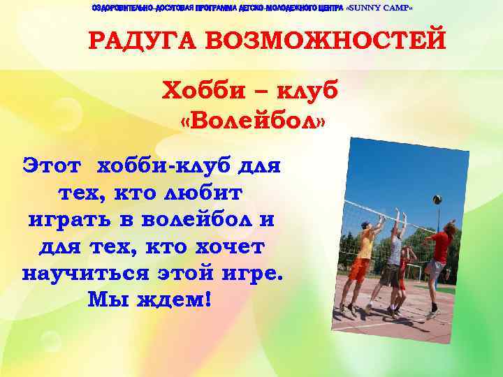 ОЗДОРОВИТЕЛЬНО-ДОСУГОВАЯ ПРОГРАММА ДЕТСКО-МОЛОДЕЖНОГО ЦЕНТРА «SUNNY CAMP» РАДУГА ВОЗМОЖНОСТЕЙ Хобби – клуб «Волейбол» Этот хобби-клуб для тех, кто любит играть в волейбол и для тех, кто хочет научиться этой игре. Мы ждем!