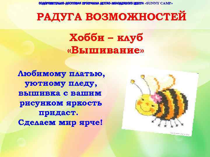 ОЗДОРОВИТЕЛЬНО-ДОСУГОВАЯ ПРОГРАММА ДЕТСКО-МОЛОДЕЖНОГО ЦЕНТРА «SUNNY CAMP» РАДУГА ВОЗМОЖНОСТЕЙ Хобби – клуб «Вышивание» Любимому платью, уютному пледу, вышивка с вашим рисунком яркость придаст. Сделаем мир ярче!
