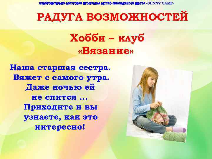 ОЗДОРОВИТЕЛЬНО-ДОСУГОВАЯ ПРОГРАММА ДЕТСКО-МОЛОДЕЖНОГО ЦЕНТРА «SUNNY CAMP» РАДУГА ВОЗМОЖНОСТЕЙ Хобби – клуб «Вязание» Наша старшая сестра. Вяжет с самого утра. Даже ночью ей не спится … Приходите и вы узнаете, как это интересно!