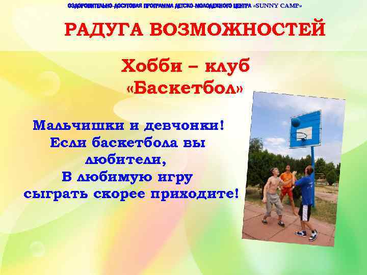 ОЗДОРОВИТЕЛЬНО-ДОСУГОВАЯ ПРОГРАММА ДЕТСКО-МОЛОДЕЖНОГО ЦЕНТРА «SUNNY CAMP» РАДУГА ВОЗМОЖНОСТЕЙ Хобби – клуб «Баскетбол» Мальчишки и девчонки! Если баскетбола вы любители, В любимую игру сыграть скорее приходите!