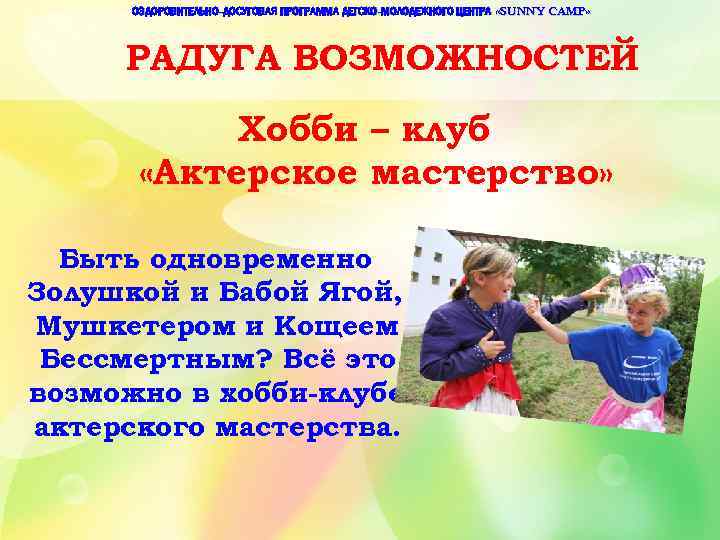 ОЗДОРОВИТЕЛЬНО-ДОСУГОВАЯ ПРОГРАММА ДЕТСКО-МОЛОДЕЖНОГО ЦЕНТРА «SUNNY CAMP» РАДУГА ВОЗМОЖНОСТЕЙ Хобби – клуб «Актерское мастерство» Быть одновременно Золушкой и Бабой Ягой, Мушкетером и Кощеем Бессмертным? Всё это возможно в хобби-клубе актерского мастерства.