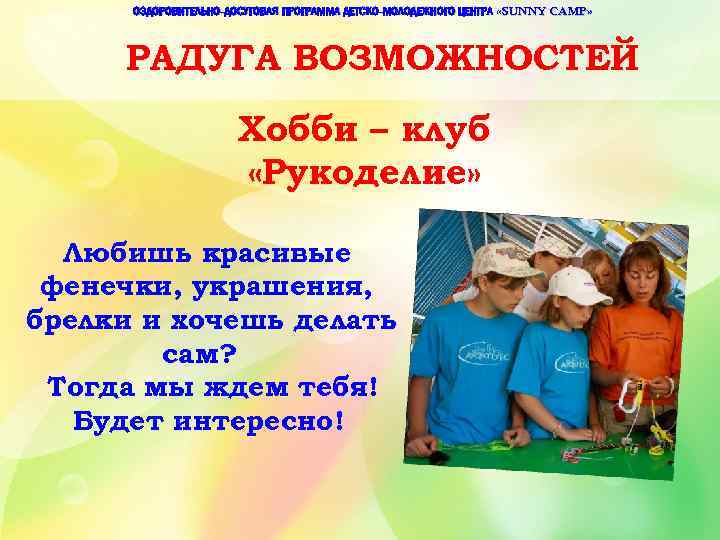 ОЗДОРОВИТЕЛЬНО-ДОСУГОВАЯ ПРОГРАММА ДЕТСКО-МОЛОДЕЖНОГО ЦЕНТРА «SUNNY CAMP» РАДУГА ВОЗМОЖНОСТЕЙ Хобби – клуб «Рукоделие» Любишь красивые фенечки, украшения, брелки и хочешь делать сам? Тогда мы ждем тебя! Будет интересно!