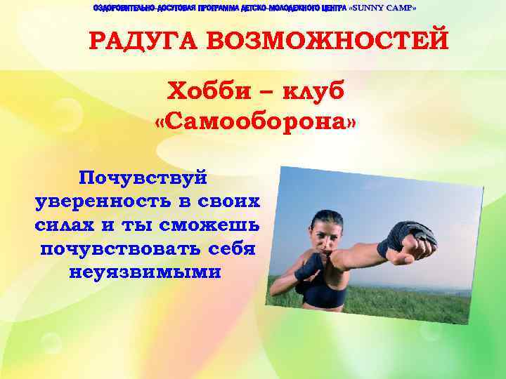 ОЗДОРОВИТЕЛЬНО-ДОСУГОВАЯ ПРОГРАММА ДЕТСКО-МОЛОДЕЖНОГО ЦЕНТРА «SUNNY CAMP» РАДУГА ВОЗМОЖНОСТЕЙ Хобби – клуб «Самооборона» Почувствуй уверенность в своих силах и ты сможешь почувствовать себя неуязвимыми