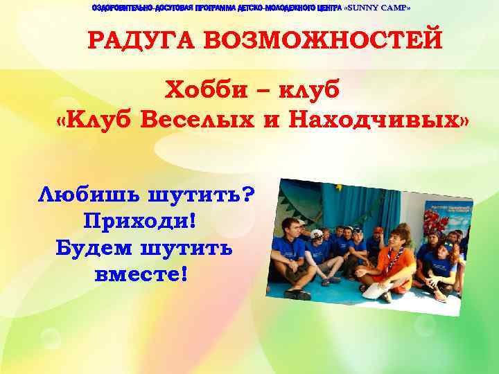 ОЗДОРОВИТЕЛЬНО-ДОСУГОВАЯ ПРОГРАММА ДЕТСКО-МОЛОДЕЖНОГО ЦЕНТРА «SUNNY CAMP» РАДУГА ВОЗМОЖНОСТЕЙ Хобби – клуб «Клуб Веселых и Находчивых» Любишь шутить? Приходи! Будем шутить вместе!