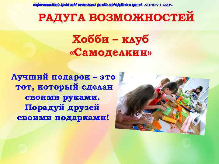ОЗДОРОВИТЕЛЬНО-ДОСУГОВАЯ ПРОГРАММА ДЕТСКО-МОЛОДЕЖНОГО ЦЕНТРА «SUNNY CAMP» РАДУГА ВОЗМОЖНОСТЕЙ Хобби – клуб «Самоделкин» Лучший подарок – это тот, который сделан своими руками. Порадуй друзей своими подарками!