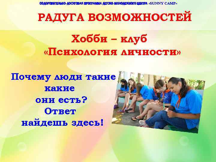 ОЗДОРОВИТЕЛЬНО-ДОСУГОВАЯ ПРОГРАММА ДЕТСКО-МОЛОДЕЖНОГО ЦЕНТРА «SUNNY CAMP» РАДУГА ВОЗМОЖНОСТЕЙ Хобби – клуб «Психология личности» Почему люди такие какие они есть? Ответ найдешь здесь!