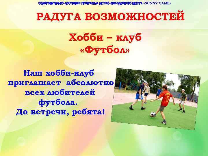 ОЗДОРОВИТЕЛЬНО-ДОСУГОВАЯ ПРОГРАММА ДЕТСКО-МОЛОДЕЖНОГО ЦЕНТРА «SUNNY CAMP» РАДУГА ВОЗМОЖНОСТЕЙ Хобби – клуб «Футбол» Наш хобби-клуб приглашает абсолютно всех любителей футбола. До встречи, ребята!