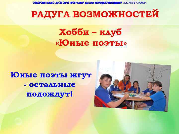 ОЗДОРОВИТЕЛЬНО-ДОСУГОВАЯ ПРОГРАММА ДЕТСКО-МОЛОДЕЖНОГО ЦЕНТРА «SUNNY CAMP» РАДУГА ВОЗМОЖНОСТЕЙ Хобби – клуб «Юные поэты» Юные поэты жгут - остальные подождут!