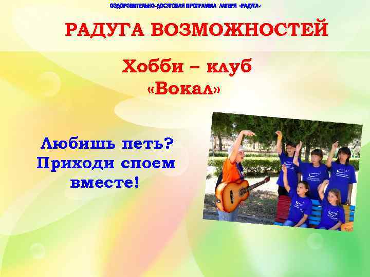ОЗДОРОВИТЕЛЬНО-ДОСУГОВАЯ ПРОГРАММА ЛАГЕРЯ «РАДУГА» «РАДУГА ВОЗМОЖНОСТЕЙ Хобби – клуб «Вокал» Любишь петь? Приходи споем вместе!
