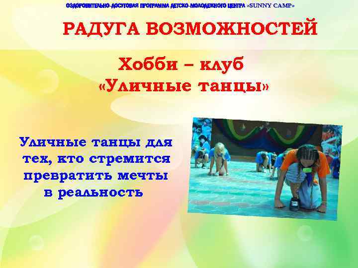 ОЗДОРОВИТЕЛЬНО-ДОСУГОВАЯ ПРОГРАММА ДЕТСКО-МОЛОДЕЖНОГО ЦЕНТРА «SUNNY CAMP» РАДУГА ВОЗМОЖНОСТЕЙ Хобби – клуб «Уличные танцы» Уличные танцы для тех, кто стремится превратить мечты в реальность
