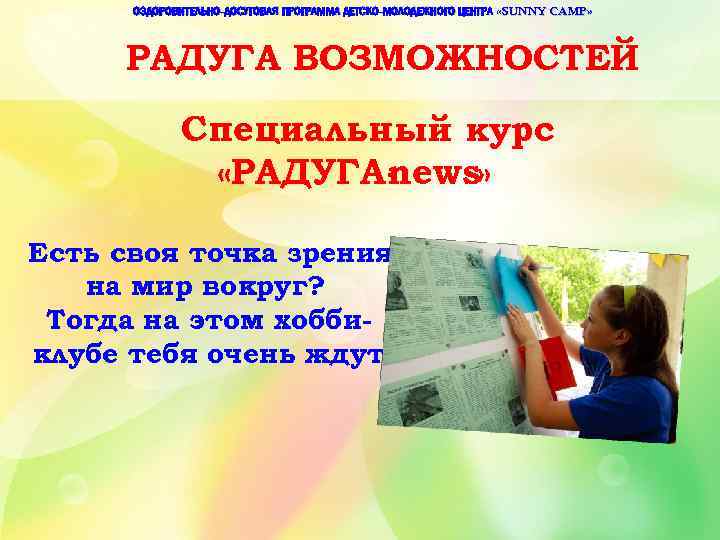 ОЗДОРОВИТЕЛЬНО-ДОСУГОВАЯ ПРОГРАММА ДЕТСКО-МОЛОДЕЖНОГО ЦЕНТРА «SUNNY CAMP» РАДУГА ВОЗМОЖНОСТЕЙ Специальный курс «РАДУГА- ews» n Есть своя точка зрения на мир вокруг? Тогда на этом хоббиклубе тебя очень ждут!
