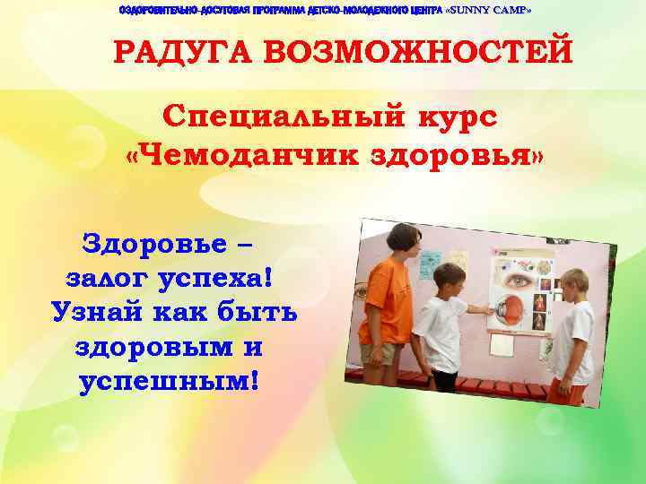 ОЗДОРОВИТЕЛЬНО-ДОСУГОВАЯ ПРОГРАММА ДЕТСКО-МОЛОДЕЖНОГО ЦЕНТРА «SUNNY CAMP» РАДУГА ВОЗМОЖНОСТЕЙ Специальный курс «Чемоданчик здоровья» Здоровье – залог успеха! Узнай как быть здоровым и успешным!