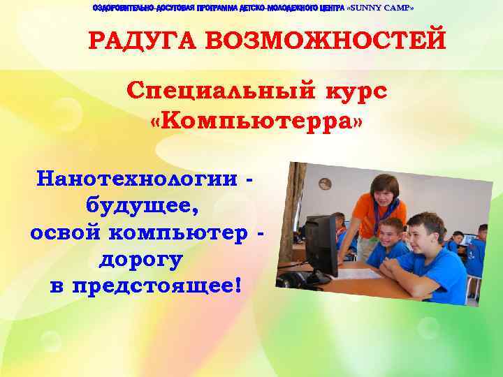 ОЗДОРОВИТЕЛЬНО-ДОСУГОВАЯ ПРОГРАММА ДЕТСКО-МОЛОДЕЖНОГО ЦЕНТРА «SUNNY CAMP» РАДУГА ВОЗМОЖНОСТЕЙ Специальный курс «Компьютерра» Нанотехнологии будущее, освой компьютер дорогу в предстоящее!