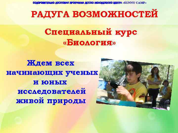 ОЗДОРОВИТЕЛЬНО-ДОСУГОВАЯ ПРОГРАММА ДЕТСКО-МОЛОДЕЖНОГО ЦЕНТРА «SUNNY CAMP» РАДУГА ВОЗМОЖНОСТЕЙ Специальный курс «Биология» Ждем всех начинающих ученых и юных исследователей живой природы