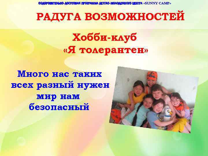 ОЗДОРОВИТЕЛЬНО-ДОСУГОВАЯ ПРОГРАММА ДЕТСКО-МОЛОДЕЖНОГО ЦЕНТРА «SUNNY CAMP» РАДУГА ВОЗМОЖНОСТЕЙ Хобби-клуб «Я толерантен» Много нас таких всех разный нужен мир нам безопасный