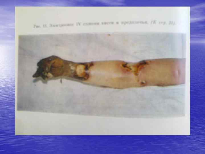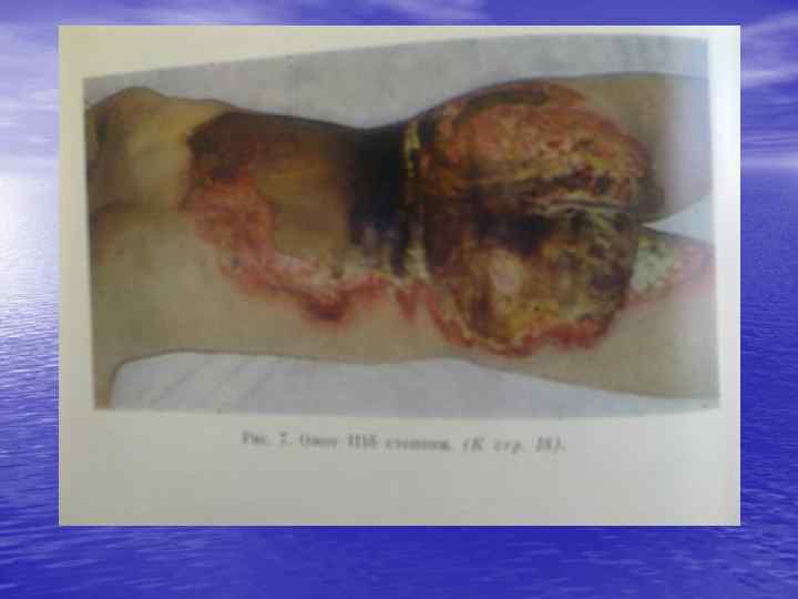 По А. В. Вишневскому, Г. Д. Вилявину, М. И. Шрайберу • • • 1 ст. -гиперемия кожи(эритема) 2 ст. отслойка эпидермиса с образованием пузырей 3 Аст. -омертвение поверхностных слоев кожи до сосочкового слоя с сохранением волосяных луковиц, потовых и сальных желез(заживление без рубцевания) 3 Б ст. -некроз всей толщи кожи(заживление с рубцеванием) 4 ст. -некроз кожи и расположенных ниже тканей(фасции, мышцы, сухожилия, кости)с обугливанием.