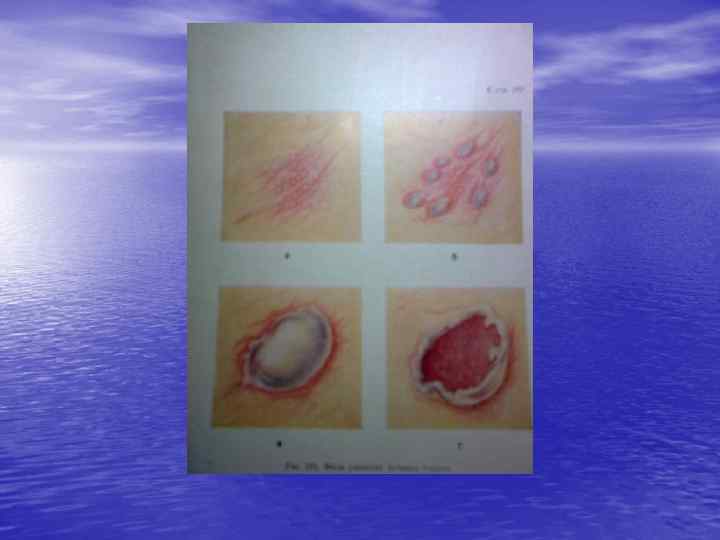 По глубине поражения • 1 ст. - обратимые расстройства кровообращения с развитием реактивного воспаления • 2 ст. - повреждение кожи до росткового слоя с образованием пузырей • 3 ст. – некроз всей кожи и глублежащих тканей • 4 ст. – некроз мягких тканей и костей.