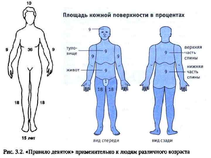 правило девяток • . При этом принимается, что площадь каждой анатомической области в процентах составляет число, кратное 9. • верхние конечности составляют 9% каждая; • нижняя конечность — 18% • передняя и задняя поверхности туловища — по 18%; • голова и шея — 9%; • промежность и половые органы — 1%. У детей соотношения другие