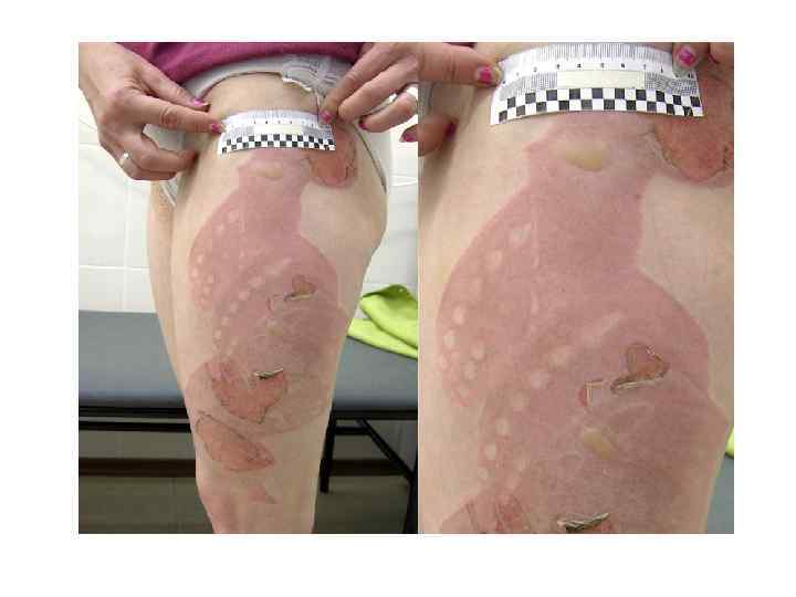 Клиника ожогов: • Ожоги I степени протекает с асептическим воспалением кожи, ее капиляры расширены, пропотевание через их стеки плазмы ведет к отеку кожи. Кожа резко гиперемирована для ожогов I ст. характерна гиперстезия – повышенная болевая чувствительность. Через несколько дней верхний слой эпидермиса высыхает, становится более темным и морщинистым, слущивается.