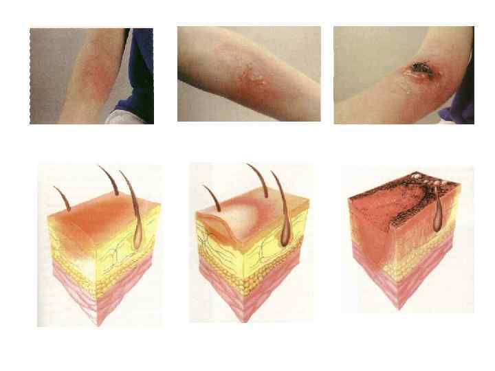 • I степень – гиперемия кожи • II степень – отслойка эпидермиса с образованием пузырей • III А степень – омертвение поверхностных слоев кожи с сохранением волосяных луковиц, потовых и сальных желез • III Б степень – гибель всей дермы • IV степень – некроз кожи и расположенных под ней тканей ( фасции, сухожилия, кости)