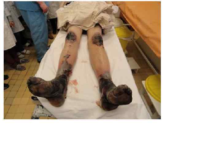 • IV степень – страдают все глублежащие ткани, в том числе и кости. Некроз мягких тканей и костей. Развивается сухая или влажная гангрена пораженного органа • Лечение: ампутация или экзартикуляция, асептическая повязка, профилактика инфекции
