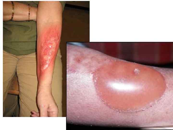 • При ожогах II степени воспалительные изменения и болевой синдром более выражены. Капиляры еще более расширяются, более выражен отек. • Под эпидермальным слоем скапливается серозный выпот (плазма), который отслаивает и приподнимает эпидермис. Появляются характерные для ожога пузыри. Содержимое пузыпей вскоре загустевает и превращается в желеобразную массу. • Обычно содержимое пузыря стерильно, но может инфицироваться. • Заживление ожогов II ст. происходит в течении 7 -14 дней без образования рубца. • При неправильном лечении ожоги II степени могут усугубляться вследствие не восстановленной микроциркуляции и трансформироваться в ожоги III ст. .