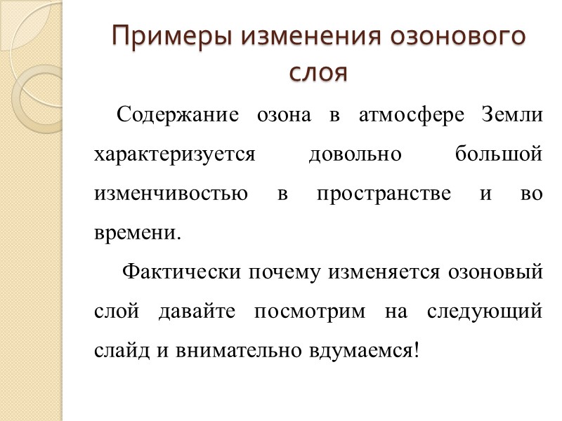 Примеры изменения озонового слоя Содержание озона в атмосфере Земли характеризуется довольно большой изменчивостью в пространстве и во времени. Фактически почему изменяется озоновый слой давайте посмотрим на следующий слайд и внимательно вдумаемся!