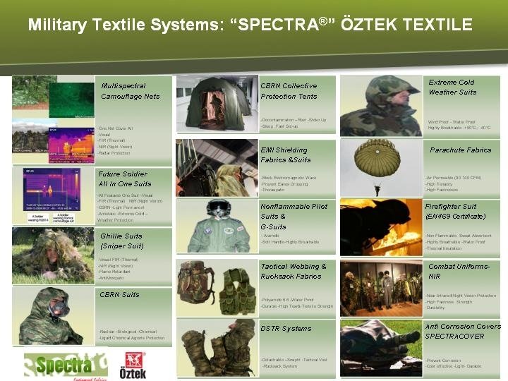 SPECTRA OZTEK TEXTILES A. S. with SPECTRA® Tex brandname is a vertically intergrated producer of military textiles. Oztek is certified as ISO 9001 -ISO 14001 -ISO 18001 GOST-OEKOTEX 100 NATO SECRET SECURITY CLEARANCE CERTIFICATE