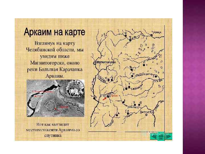 Арқайым қаласының табылуы ғалымдар үшін ең үлкен жаңалықтардың бірі болды. Ғылым әлемінде бұл сенсациялық жаңалық “Қалалар ел”і, ал оған тән мәдениет “Арқайым-сынтасты мәдениеті”. ( б. з. д 4 -2 мыңжылдық) деп аталады. Сынтасты қаласына қарағанда ол баз қалпында, идеалды жағдайда са. Оның бірегейлігі сол, мұндағы әрбір қоныс әрі қала, әрі қамал, әрі храм, әрі обсерватория, әрі өндірістік металлургиялық орталық десек болады. Әрбір қала алдын ала ойластырылған жоспар бойынша салынған, әуелі тұрғылықты жер нақты белгіленіп, межеленген, тіптен болашақ қаланың макет-жобасы да қолдарында болған. Олардың жобалауы да әртүрлі, бірі иілген, бірі шеңбер типтес не шартарап, квадратты құраған. Қалалардың арасы 40 -70 км, бұл - жүк артқан салт аттының бір күндік жолы. Қала айналасына оның 20003000 тұрғынын азық-түлікпен, ауыл шаруашылығы өнімдерімен қамтамасыз ететін ауылдар орналасқан. қталған. Оның жалпы ауданы - 20 мың шаршы метр.