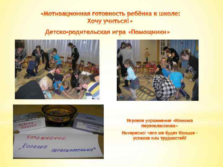 № п/п Тема занятия 1. Диагностический этап. Родительское собрание в подготовительной группе. 2. Установочный этап. «Знакомство» . 3. Практический этап. «Мотивационная готовность ребёнка к школе: Хочу учиться!» 4. «Личностная готовность. Формирование самооценки» . 5. «Общение с дошкольниками. Правила общения» . 6. «Активное слушание» . 7. «Обратная связь. Оценка деятельности ребёнка взрослым» . 8. «Правила и ограничения в жизни ребёнка» 9. «Коммуникативная готовность к школе» 10. «Интеллектуальная готовность к школе» 11. 12. «Эмоционально-волевая готовность к школе» Этап оценки эффективности программы. «Первый раз – в первый класс»