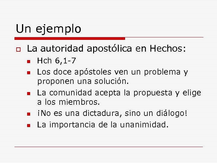 Un ejemplo o La autoridad apostólica en Hechos: n n n Hch 6, 1 -7 Los doce apóstoles ven un problema y proponen una solución. La comunidad acepta la propuesta y elige a los miembros. ¡No es una dictadura, sino un diálogo! La importancia de la unanimidad.