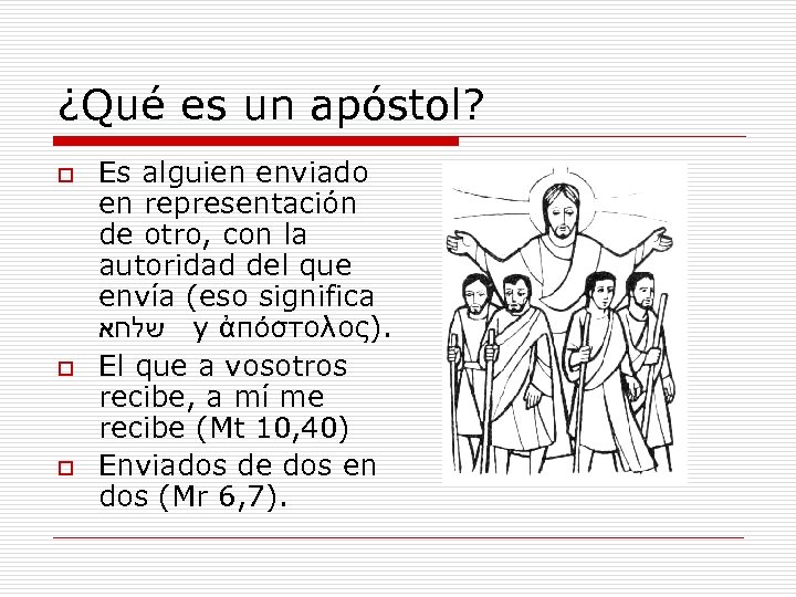 ¿Qué es un apóstol? o o o Es alguien enviado en representación de otro, con la autoridad del que envía (eso significa שלחא y ἀπόστολος). El que a vosotros recibe, a mí me recibe (Mt 10, 40) Enviados de dos en dos (Mr 6, 7).