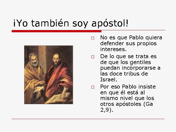 ¡Yo también soy apóstol! o o o No es que Pablo quiera defender sus propios intereses. De lo que se trata es de que los gentiles puedan incorporarse a las doce tribus de Israel. Por eso Pablo insiste en que él está al mismo nivel que los otros apóstoles (Ga 2, 9).