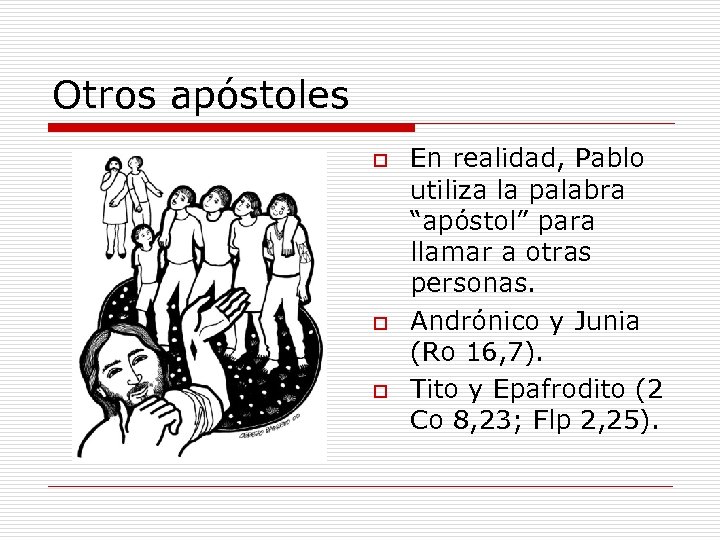Otros apóstoles o o o En realidad, Pablo utiliza la palabra “apóstol” para llamar a otras personas. Andrónico y Junia (Ro 16, 7). Tito y Epafrodito (2 Co 8, 23; Flp 2, 25).