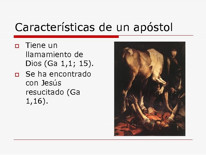 Características de un apóstol o o Tiene un llamamiento de Dios (Ga 1, 1; 15). Se ha encontrado con Jesús resucitado (Ga 1, 16).