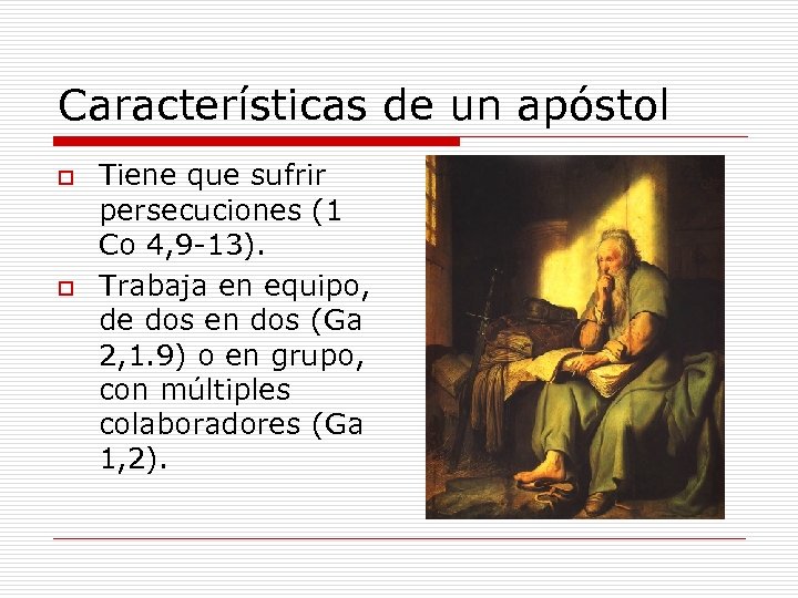 Características de un apóstol o o Tiene que sufrir persecuciones (1 Co 4, 9 -13). Trabaja en equipo, de dos en dos (Ga 2, 1. 9) o en grupo, con múltiples colaboradores (Ga 1, 2).
