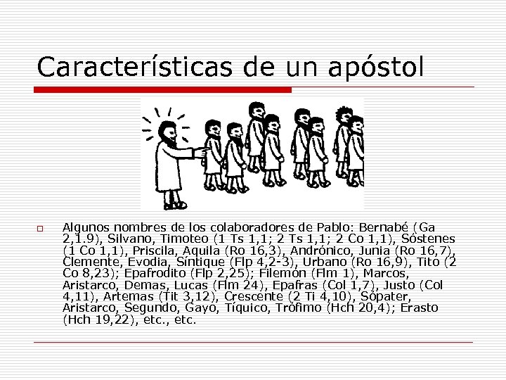 Características de un apóstol o Algunos nombres de los colaboradores de Pablo: Bernabé (Ga 2, 1. 9), Silvano, Timoteo (1 Ts 1, 1; 2 Co 1, 1), Sóstenes (1 Co 1, 1), Priscila, Aquila (Ro 16, 3), Andrónico, Junia (Ro 16, 7), Clemente, Evodia, Síntique (Flp 4, 2 -3), Urbano (Ro 16, 9), Tito (2 Co 8, 23); Epafrodito (Flp 2, 25); Filemón (Flm 1), Marcos, Aristarco, Demas, Lucas (Flm 24), Epafras (Col 1, 7), Justo (Col 4, 11), Artemas (Tit 3, 12), Crescente (2 Ti 4, 10), Sópater, Aristarco, Segundo, Gayo, Tíquico, Trófimo (Hch 20, 4); Erasto (Hch 19, 22), etc.