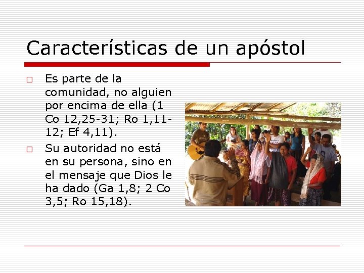 Características de un apóstol o o Es parte de la comunidad, no alguien por encima de ella (1 Co 12, 25 -31; Ro 1, 1112; Ef 4, 11). Su autoridad no está en su persona, sino en el mensaje que Dios le ha dado (Ga 1, 8; 2 Co 3, 5; Ro 15, 18).
