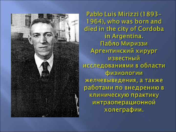 . Пабло Мириззи Опираясь на результаты интраоперационной холеграфии впервые описал сужение общего печёночного протока , а так же свищ между желчным пузырём и внепечёночным желчным протоком