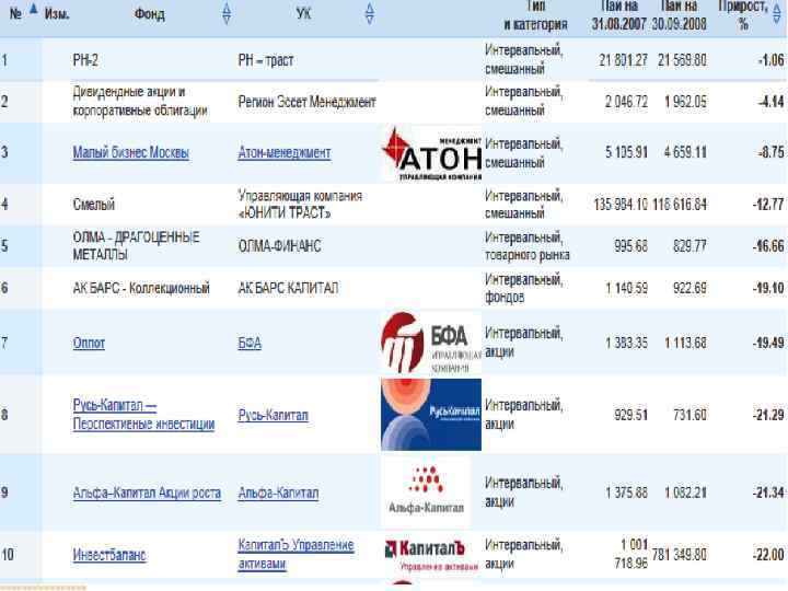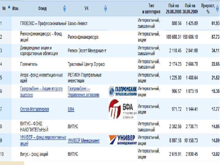 Рэнкинг открытых паевых инвестиционных фондов по доходности за период с 28. 09. 2007 по 30. 09. 2008 Место ПИФ Категория фонда Доходность 1 ОТКРЫТИЕ - Облигации фонды облигаций 11, 48% 2 Паллада-Фонд облигаций фонды облигаций 9, 65% Высокорискованные 3 (бросовые) облигации фонды облигаций 9, 37% 4 Агора-Фонд сбережений фонды смешанных инвестиций 7, 81% Урал. Сиб Фонд 5 Консервативный фонды облигаций 7, 44% 6 Финам Облигационный фонды облигаций 7, 27% 7 Газпромбанк-Казначейский фонды облигаций 6, 86% 8 Финам Депозитный фонды денежного рынка 6, 32% 9 Финансист фонды облигаций 6, 18% фонды смешанных инвестиций 5, 90% 10 Топаз