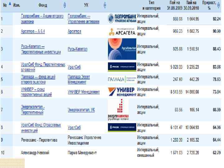 Рэнкинг открытых паевых инвестиционных фондов по доходности за период с 30. 09. 2008 по 30. 09. 2009 Место ПИФ Категория фонда Доходность Энергокапитал 1 Сбалансированный фонды смешанных инвестиций 113, 15% 2 Агрессивный фонды смешанных инвестиций 112, 56% 3 Глобал Капитал – Акции фонды акций 107, 78% 4 Интерфин Телеком фонды акций 97, 19% Замоскворечье – фонд 5 энергетики фонды акций 96, 26% 6 Финам Первый фонды смешанных инвестиций 85, 81% 7 Стоик-Электроэнергетика фонды акций 81, 59% ВТБ-Фонд 8 Электроэнергетики фонды акций 80, 79% фонды смешанных 9 Глобэкс-Сбалансированный инвестиций 10 Универ-Фонд акций фонды акций 74, 86% 74, 35%