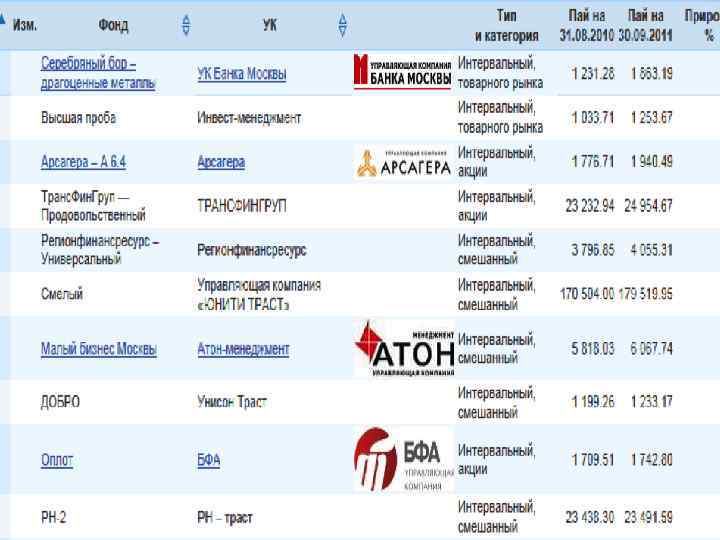 Рейтинг Закрытых ПИФов по доходности за год с 30. 09. 2010 -30. 09. 2011 номер Фонд Категория 1 Лига инвесторов недвижимость 2 Подмосковная недвижимость Пай на 30. 09. 2010 Пай на 30. 09. 2011 Прирост % 361291, 07 30072010 8223, 49 47738, 72 142554, 62 198, 61 34380, 22 81005 135, 62 1323, 18 2419, 71 82, 87 1318, 03 1937, 6 47, 01 2101, 51 2924, 37 39, 16 839, 4 1138, 27 35, 61 недвижимость 3 Иарт девелопмент 4 Казанский гастроном недвижимость 5 Шаляпин 6 Ай Пи Ти. Недвижимость 7 СМ. Артнедвижимость Квадратные метры 8 РЕГИОН Земельный фонд рентный 800, 43 1046, 75 30, 77 9 Ренессанс. Земельный рентный 552, 77 717, 35 29, 77 10 Третий Земельный недвижимость 5959, 06 7480, 46 25, 53 недвижимость
