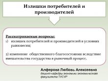 Излишки потребителей и производителей Рассматриваемые вопросы 1 излишек