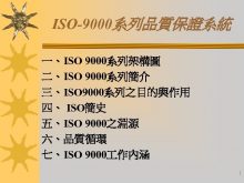 ISO-9000系列品質保證系統 一 ISO 9000系列架構圖 二 ISO 9000系列簡介 三 ISO 9000系列之目的與作用 四